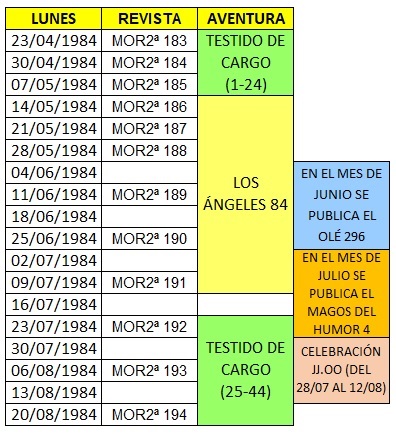 Hediondo escribe sobre otra aventura cortada para publicar otra pero luego continuada... que no deja de ser una total falta de respeto al lector o lectora, por supuesto: Comparando los datos del listado de Penguin, en realidad, por orden de producción Los Ángeles 84 debe situarse antes de "Testigo de cargo": Es cierto que esta última empezó a seriarse antes que la otra, pero quedó interrumpida en su página 24 para dar paso a la historieta de ambientación olímpica, que se editó entre los meses de mayo a julio, para luego terminar de publicarse el resto de episodios de la historieta con Sacarino como "artista invitado". Está claro que el motivo de esta interrupción era que el evento deportivo tenía prioridad sobre cualquier otra cosa y, por tanto, convenía publicar la aventura antes de que estos juegos se celebrasen, o al menos, antes de que terminaran. Y precisamente en aquellos convulsos tiempos para la editorial, en la que había períodos en que no podían continuar con la aparición semanal de la revista Mortadelo y se veían obligados a hacerla catorcenal, es lógico que se vieran aún más agobiados por publicar la aventura completa antes de que fuera comercialmente demasiado tarde. Fijaos que, excepcionalmente, el Olé de Bruguera que lo contuvo (el 296) salió un mes antes de que acabase de seriarse la misma en la revista Mortadelo 2ª etapa (MOR2ª). Y no sólo eso, la aventura en tapa dura (el Magos del Humor nº 4) también salió en el mismo mes de julio, a la par que se terminaba su publicación en dicho semanario.
